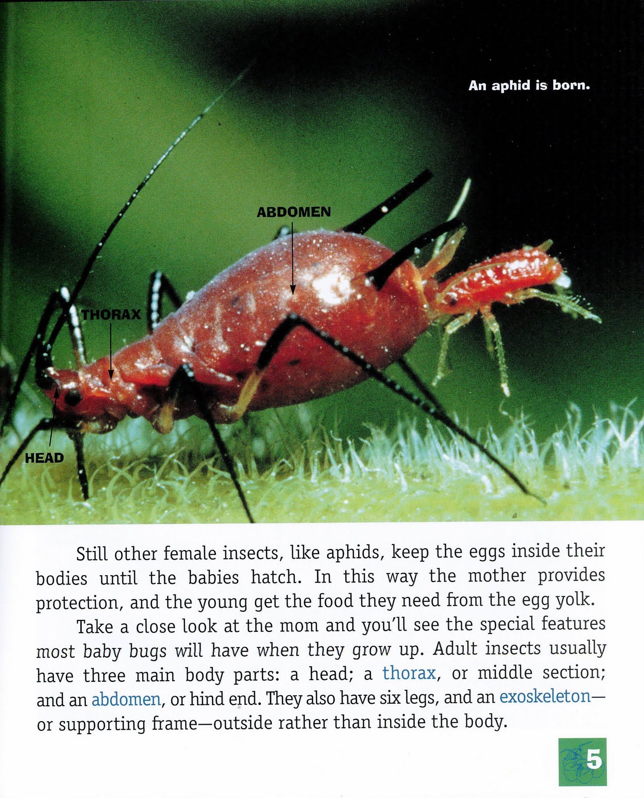 The mother aphid keeps her developing young safe by holding the eggs inside her body until they hatch. Then the young emerge ready to fend for themselves.