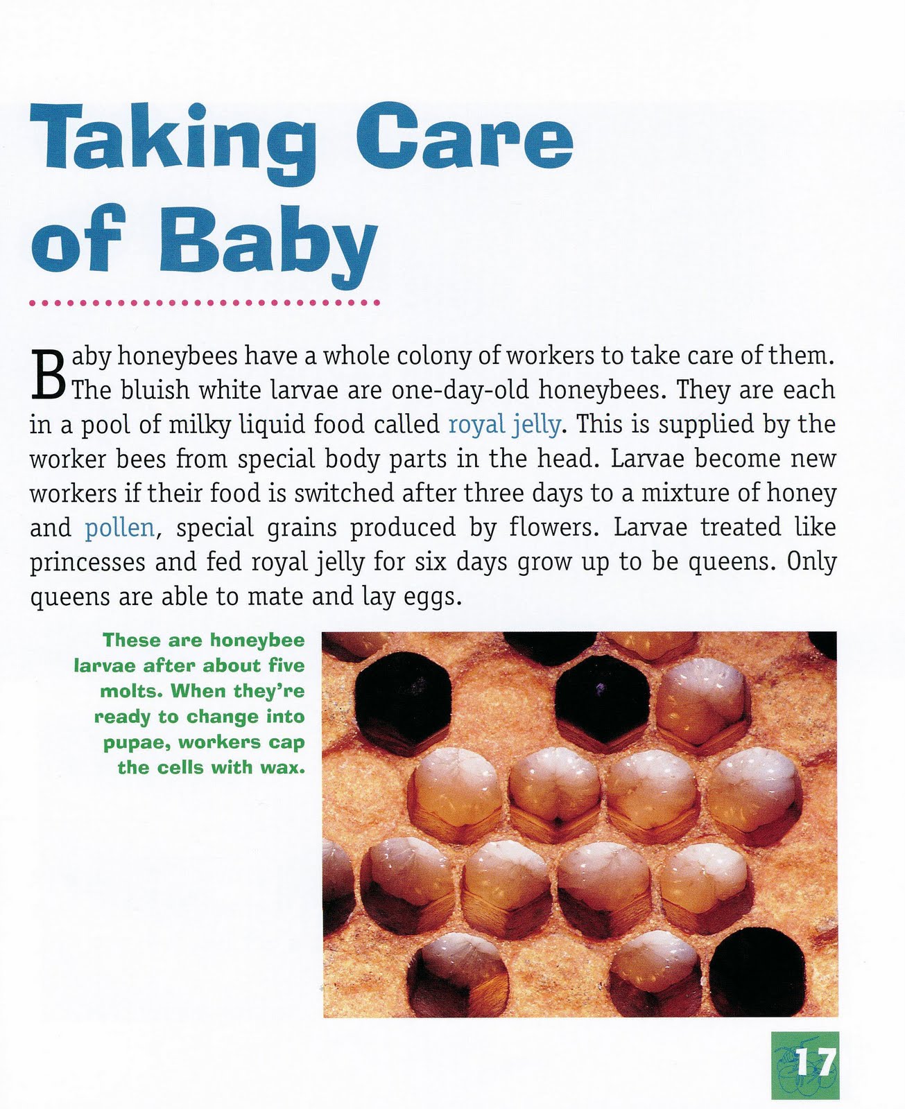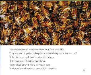 Look at the honeybees on page 21. Are honeybees careful to stay away from other honeybees? Their behavior is related to the fact honeybees depend on each other to do a big job: warm up or cool off their hive (home). Think what your body does when you get chilled? You shiver. So do bees. Each shivering bee gives off a tiny bit of heat. Whenever the temperature drops below about 55F/13C outside, the shivering honeybees group together in a ball around the queen, the female bee that producing eggs. The colder it gets outside, the tighter the bees huddle. Even when it's below freezing, the center of the bee cluster is likely to be about 90F/32C.