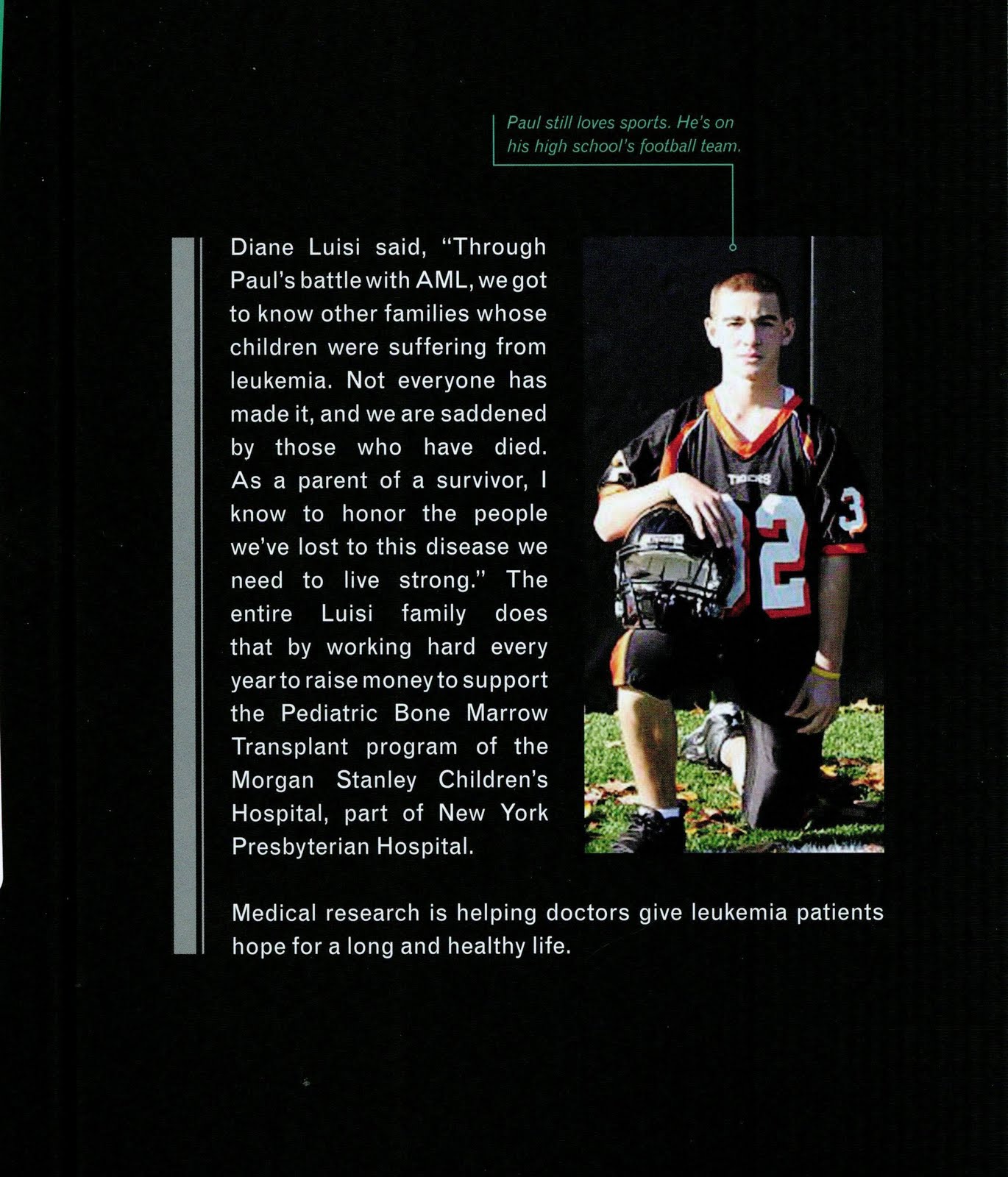 Paul's mother Diane shares what it was like to learn her child had leukemia and how the entire Luisi family rallied around Paul during his chemotherapy. His dad even shaved his head when Paul lost his hair during chemotherapy.