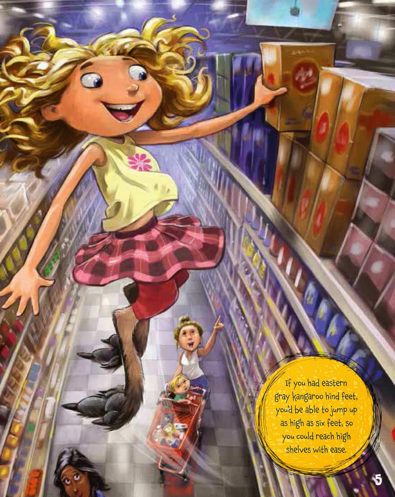 NOW, imagine having kangaroo feet. Invite them to share how that might change how they do each of these activities:Run a raceTake a bathPlay baseball