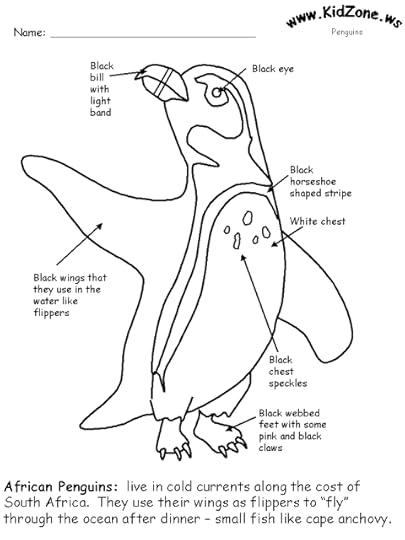 Check out the photo of an African penguin on the cover of THE GREAT PENGUIN RESCUE . African penguins always have that pinkish area by their eyes. Be sure to color the white areas of the penguin too.