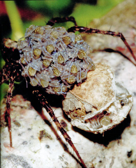 As I watched, a round ball about one-third as big as the spider and stuck to its spinnerets split open. Hundreds of tiny spiders crawled out and climbed onto the big spider.