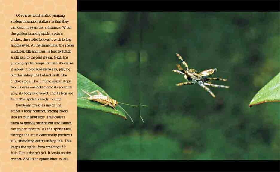 How could it possibly jump so far? To find out, read Jumping Spiders: Gold Medal Stalkers pages 22 and 23. *Or check the answers from Spider Clause at the very end.