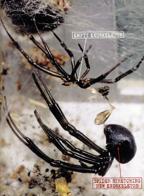 As I watched, that black widow spider dangled upside down from a silk thread. Next, its exoskeleton (armor-like covering) split open along the back. Then the spider pushed and pulled and crawled out of its exoskeleton.