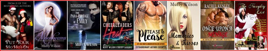 Muffy, author of provocative romance about love, sex, hope and passion, was born in Texas to traditional parents. With two older brothers, she was the youngest, the family "princess," indulged and pampered. Her father was a career Colonel and pilot in the U.S. Air Force which required the family to travel extensively. Muffy spent her formative years in Europe and 'came of age' in France which forged her joie de vivre and love for books, writing and education. ~ Live, Laugh, Love with PassionWebsite | Blog | Twitter | Email | DitterVerse | Facebook | FB Fan Page | YouTube Trailers | Mailing List Sign-Up | Google+ | Pinterest | Triberr| TSU| Wordpress | Amazon | Ganxy | XinXii| Kobo Books | iTunes Books | Barnes and Noble | All Romance eBooks | Smashwords | Goodreads | Yellow Silk Dreams Publishing | Secret Cravings Publishing | The Romance Review | Manic Readers | The Muffy Wilson Daily | Muffy Wilson Literotica | Cheerleaders in Heat News