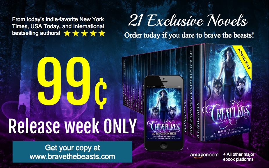 You are about to enter the realm of Creatures, a boxed set packed with more than twenty enthralling tales of urban fantasy and paranormal romance! From witches to vampires, shifters to fae, and every dark creature known to lurk the pages of fantasy fiction, you’re sure to find yourself up past your bedtime and reading well into the witching hour!