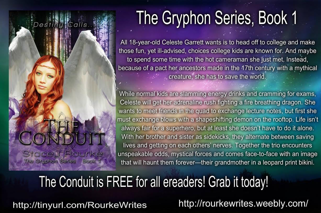 All 18-year-old Celeste Garrett wants is to head off to college and make those fun, yet ill-advised, choices college kids are known for. And maybe to spend some time with the hot cameraman she just met. Instead, because of a pact her ancestors made in the 17th century with a mythical creature, she has to save the world.While normal kids are slamming energy drinks and cramming for exams, Celeste will get her adrenaline rush fighting a fire breathing dragon. She wants to meet friends in the quad to exchange lecture notes, but first she must exchange blows with a shapeshifting demon on the rooftop. Life isn’t always fair for a superhero, but at least she doesn’t have to do it alone. With her brother and sister as sidekicks, they alternate between saving lives and getting on each others’ nerves. Together the trio encounters unspeakable odds, mystical forces and comes face-to-face with an image that will haunt them forever—their grandmother in a leopard print bikini.Okay, little side note here. If a psychopathic killer asks if you want to see a trick, say no. That’s the smart thing to do. I, on the other hand, responded, “Bring it.”-excerpt from THE CONDUIT