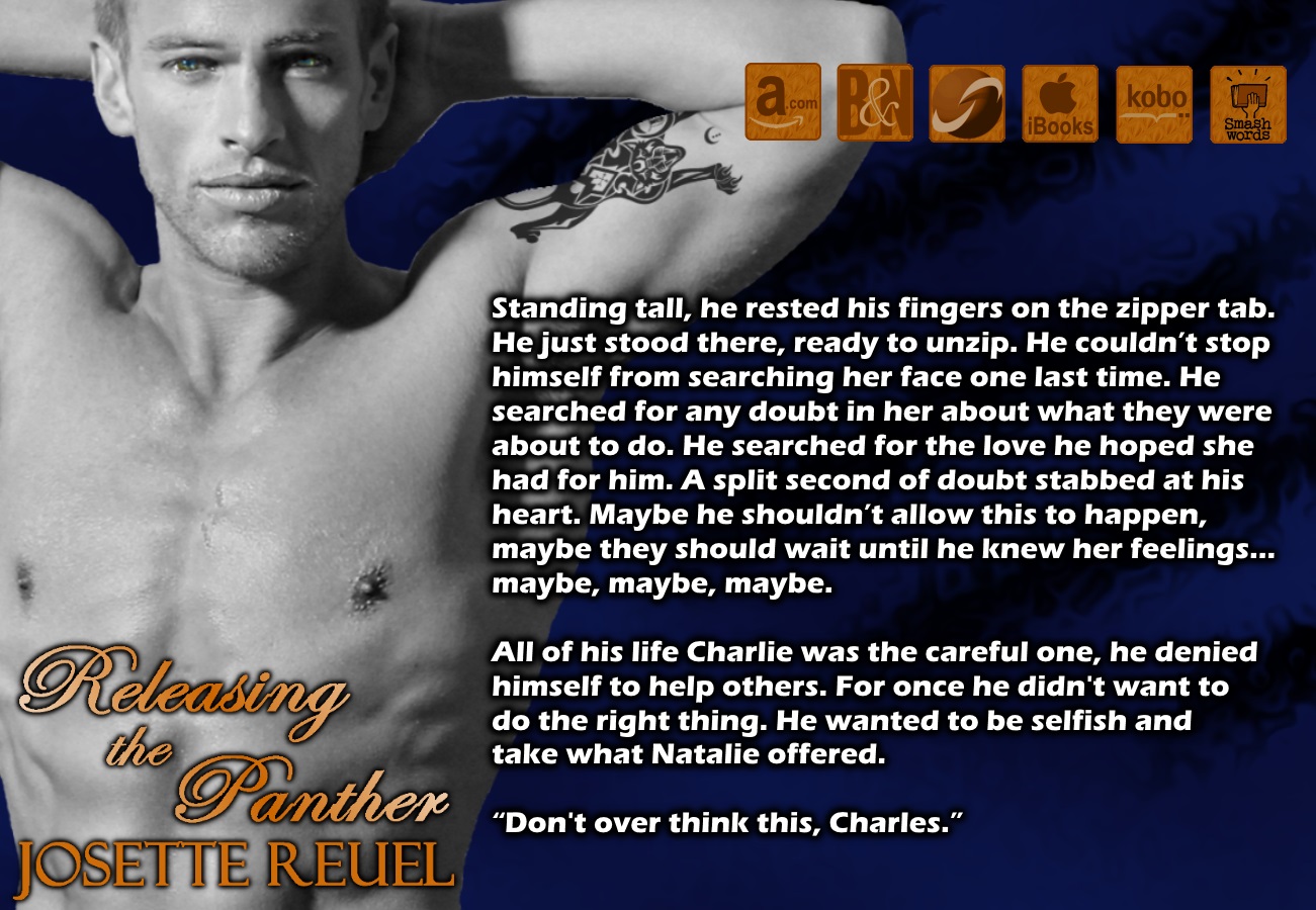 Toeing off her shoes, she realized that she held her hand against her chest. It still buzzed from where Charlie had touched it and she felt the need to protect herself from whatever the electricity was that had moved through her body at his touch. Since the day she’d visited the psychic she hadn’t slept worth a damn. Dreams of panthers and of a man with blond hair had tormented her awake each night. Then she saw that tattoo. Since then, the dreams became even more detailed, and when she’d seen Charlie…