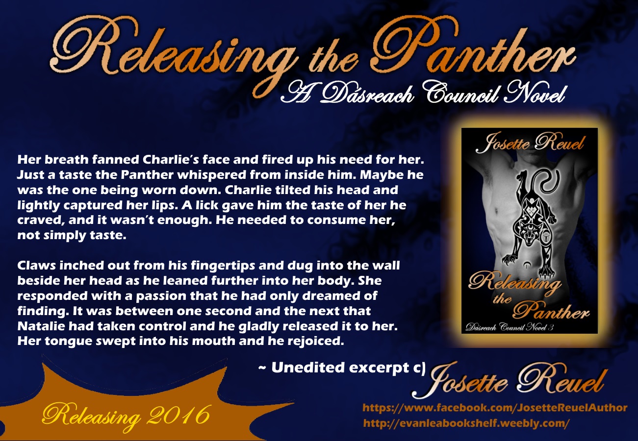BOOK INFORMATIONTITLE – Releasing the PantherSERIES (& Book #) – Dásreach Council Novels AUTHOR – Josette ReuelGENRE – Paranormal RomancePUBLICATION DATE – 5/26/2016LENGTH (Pages/# Words) – 115K WordsPUBLISHER – Josette ReuelCOVER ARTIST – Evanlea Designs/ Christopher ReuelNOTE – Books Must Be Read in Order