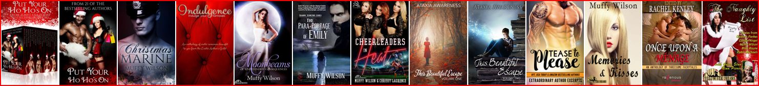Website | Blog | Twitter | Email | Amazon Author Page | DitterVerse | Facebook | FB Fan Page | YouTube Trailers | Mailing List Sign-Up | Google+ | Pinterest | Triberr| TSU| Wordpress | Ganxy | XinXii| Kobo Books | iTunes Books | Barnes and Noble | All Romance eBooks | Smashwords | Goodreads | Yellow Silk Dreams Publishing | Secret Cravings Publishing | The Romance Review | Manic Readers | The Muffy Wilson Daily | Muffy Wilson Literotica | Cheerleaders in Heat News