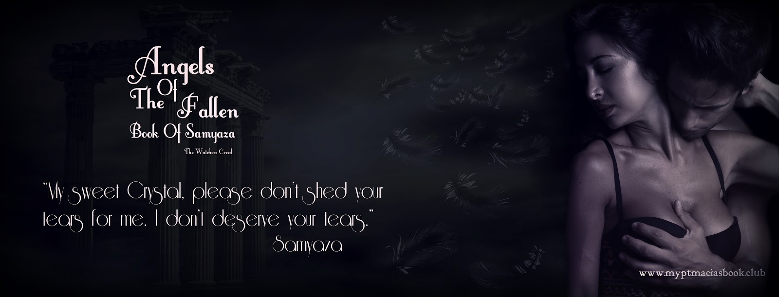 “My sweet Crystal, please don’t shed your tears for me. I don’t deserve your tears. I promise you that I’m going to be ok.”She buries her face into his sculpted chest. She rests her hands on his waist, sobbing. A few seconds later she pulls back to look up at him and blinks rapidly.“Yazy, take more of my blood. I don’t mind. Please.”Samyaza raises his black eyebrow and his violet eyes glow.“Sweetness, are you sure? I don’t want to hurt or scare you.”