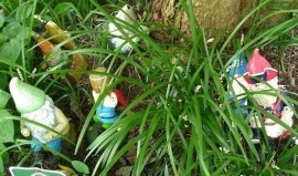 A jumble of tiny painted clay gnomes set beneath a maple tree.