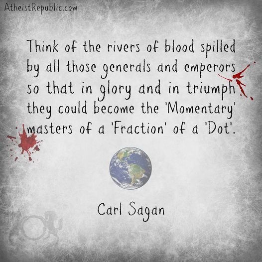 “Man is the only animal that deals in that atrocity of atrocities, War. He is the only one that gathers his brethren about him and goes forth in cold blood and calm pulse to exterminate his kind. He is the only animal that for sordid wages will march out…and help to slaughter strangers of his own species who have done him no harm and with whom he has no quarrel. ..And in the intervals between campaigns he washes the blood off his hands and works for ‘the universal brotherhood of man’–with his mouth.” Mark Twain – What Is Man?