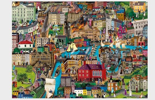 The World of Charles DickensA great many of the others I'd never have guessed, though. I did spot the rowboat with Pip, Herbert Pocket, and Magwitch the convict from Great Expectations, but Estella and Miss Havisham were less clear to me. A great many of the 70-odd characters included just looked like typical Victorians in breeches and bonnets. But an immense amount of ingenuity had been spent on the layout and colouring of the picture - so many windows and roofs to identify! Not to mention fields, bushes and lawns ... In fact, if it hadn't been for the Thames running through it, the puzzle might well have proved insuperable.