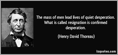 The mass of men lead lives of quiet desperation.It's one of the most famous quotes in American literature. But what does it mean? Stern is very helpful here, as he quotes in the margin from the original version of the passage, where Thoreau gave a long account of an Irish workman moving from job to job without being able to settle in any of them - due mainly to his ever increasing air of desperation, and his gradually disintegrating attire.