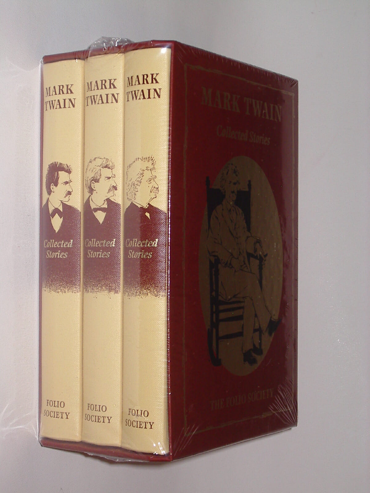 Collected Stories, by Mark Twain. [3 vols]. Bound in image blocked cream Buckram. Black & white illustrations by Roger Fereday. Three volume maroon image printed slipcase. 928 pp. 24 x 15 cm.Folk Tales of Britain: Narratives. (3 vols). Collected and edited by Katharine M. Briggs. Preface by Philip Pullman. Bound in buckram, blocked with individual designs by Hannah Firmin et al. 25 cm.