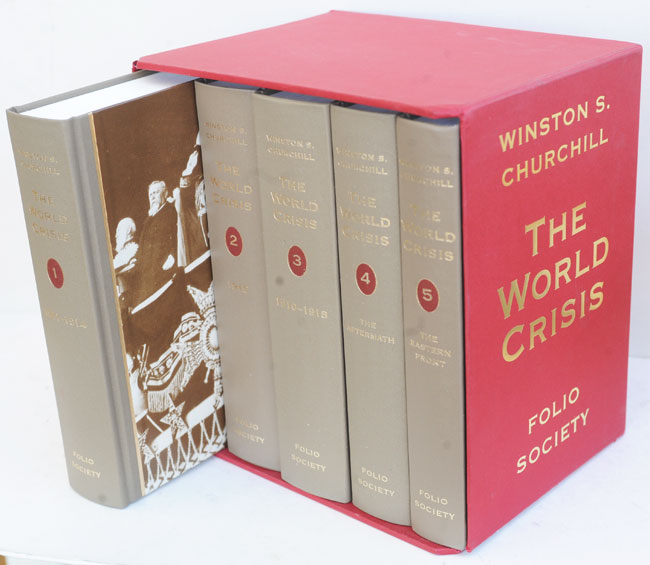 The World Crisis, by Winston Churchill. (5 vols). Volume 1 1911-1914 xvii plus 464 pages. Volume 2 1915 xiii plus 453 pages. Volume 3 1916-1918 xiii plus 474 pages. Volume 4 The Aftermath xii plus 383 pages. Volume 5 The Eastern Front xii plus 311 pages. All volumes include b&w textual maps and b&w illustrations. Three-quarter bound in grey cloth with printed cover. Title gilt printed on crimson slipcase.