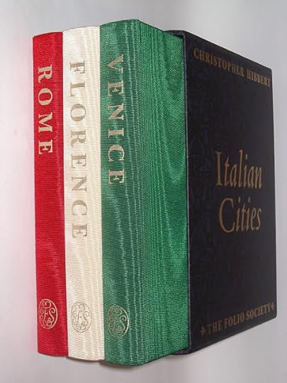 Italian Cities, by Christopher Hibbert. (3 vols). Full artificial silk (a different colour for each volume), decorated in gold, endleaves printed in gold to a design by David Eccles. 16 pages of colour plates in each volume. Dark blue three-volume slipcase printed in black and titled in gold. Volumes form colours of Italian flag in slipcase. 1. Venice. Green binding, dark green endleaves. 436 pp. 2. Florence. Cream binding, dark brown endleaves. 398 pp. 3. Rome. Red binding, dark red endleaves. 388 pp. 25.2 x 19.6 cm.