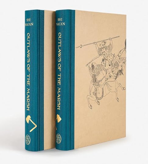 Outlaws of the Marsh: The Water Margin, by Shi Nai’an. (2 vols). Introduced by Frances Wood. Translated by J. H. Jackson. Illustrations from the Rong Yu Tang edition by Shi Nai'an. Three-quarter bound in image blocked aqua-blue Art Silk with a printed cloth front board. Illustrated title pages and 141 woodblock illustrations. Ribbon markers. Gilded page tops. Image printed light brown cloth slipcase. 880 pp. in total. 11 x 7¼ in.