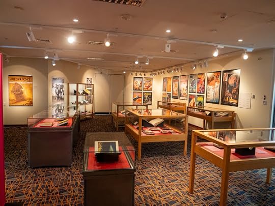 , curated by Andrew Henry & Renee Orr (19 February - 2 August 2025)You feel it the moment you walk in the door of Other Worlds , the latest exhibition in the Rare Books Room at Auckland's Central City Library, an exploration of the "imaginative worlds of science fiction ... featuring books, magazines, comics and posters from Auckland Libraries Heritage Collections."