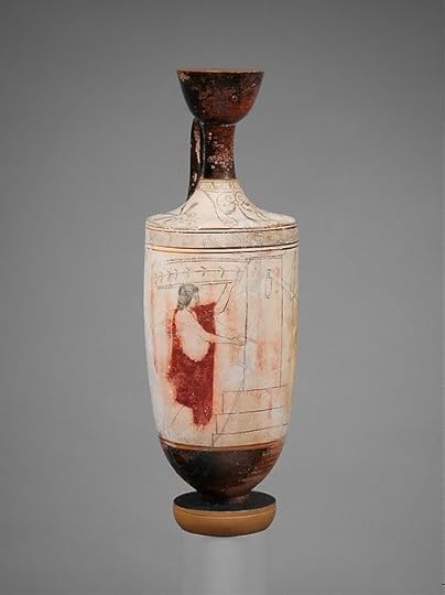 The dish stood alone in its case, a typed label on the glass: "Attic Krater, 5th Century BC, Artist Unknown. The scene depicts Charon, ferryman of the dead, conveying a soul across the river Acheron in the Underworld."He persuades the curator to let him take it out for a moment: