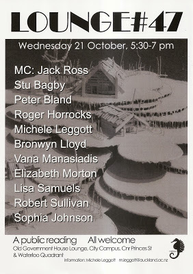 The LOUNGE readings are a continuing project of the New Zealand Electronic Poetry Centre (nzepc), Auckland University Press and Auckland University English, Drama and Writing Studies, in association with the Staff Common Room Club at Old Government House, and — in this case — Poetry NZ.