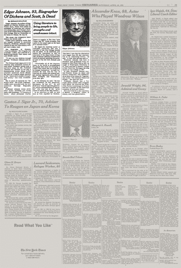 Edgar Johnson (1902-1995)The major monument to this tradition would, however, have to be Edgar Johnson's exhaustive two-volume critical biography Charles Dickens: His Tragedy and Triumph (1952). Johnson's "life and times" approach - which he applied again, a couple of decades later, to his similarly vast biography of Sir Walter Scott, The Great Unknown (1970) - has been found offputting by some (Peter Ackroyd principal among them). For myself, I love it.