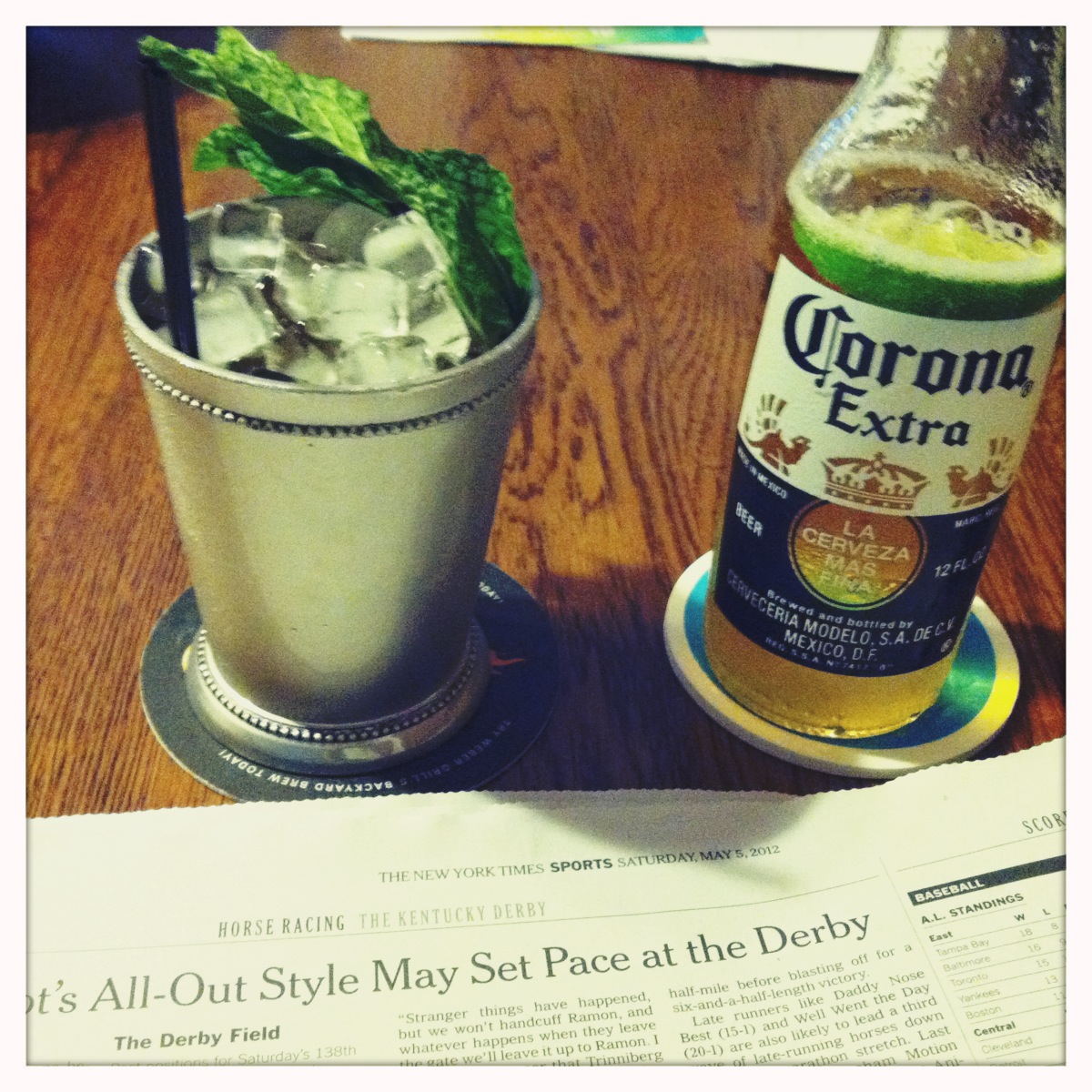 I also wished I'd bet money on the damned thing. Sadly, I'm not a gambling man, even though some of my literary heroes (namely Bukowski) liked to spend a lot of time and money on the ponies. If I did follow a sport, horse racing would be awfully appealing. Over in about two minutes, and usually involves drinking in the sun. This year, I made my not-so-bad Julep and paired it with a Corona and lime, in honor of Cinco de Mayo: