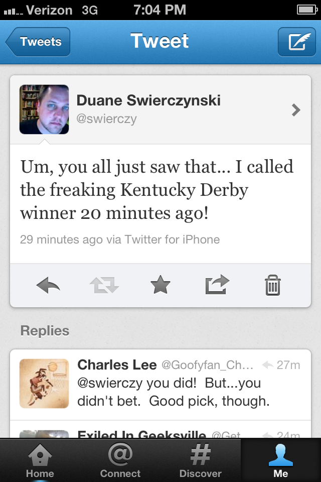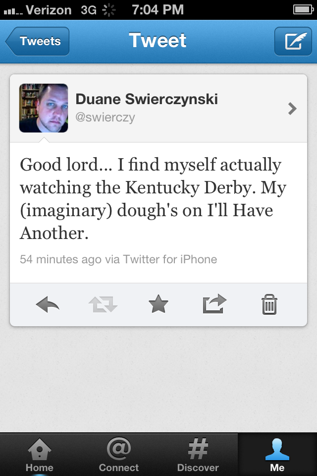 For years I've enjoyed Kentucky Derby weekend... without watching a single minute of the actual race. Usually, it's all about the Hunter S. Thompson and the mint juleps. Well, this year I decided to actualy watch it. My first horse race, ever. I posted this on Twitter, along with my pick: