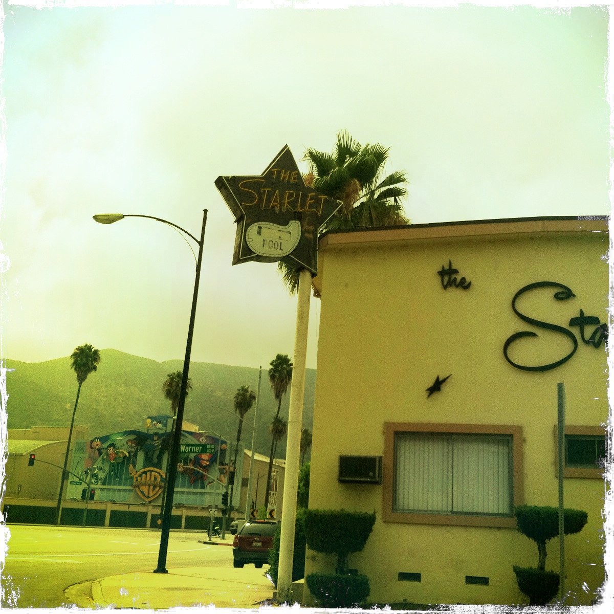 Saw this joint, The Starlet, just a stone's throw from the Warner Bros. lot and just fell in love. Furnished apartments, but also (according to the neon sign) there's a POOL, and if the illustration is to be believed, random buxom starlets on the premises. In the deep background there are a gang of DC Comics and WB toon characters (Batman, Daffy Duck, Superman, Tweety Bird) exploding out of the side of Stage 3. If this image doesn't scream Burbank, nothing does.
