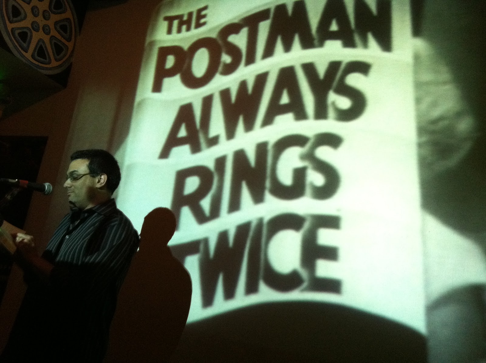 Yes, it's been a full week since my last post, but that doesn't mean I was sitting poolside, lost in a haze of bourbon and Pinkberry. It's been a busy week, let me tell you. When we last left off... oh yeah, I was headed off to the very first Noir at the Bar L.A., hosted by Eric Beetner, Stephen Blackmoore and Aldo "El Jefe" Calcagno. And it was a true blast. Great crowd, a great lineup of writers (including Josh Stallings and Holly O'Neill West) and a cool space (the Mandrake) that allowed us all to read with an endless loop of film noir trailers playing behind us, which created some interesting, random moments. Check out Mr. Blackmoore with a little James M. Cain backing himu up: