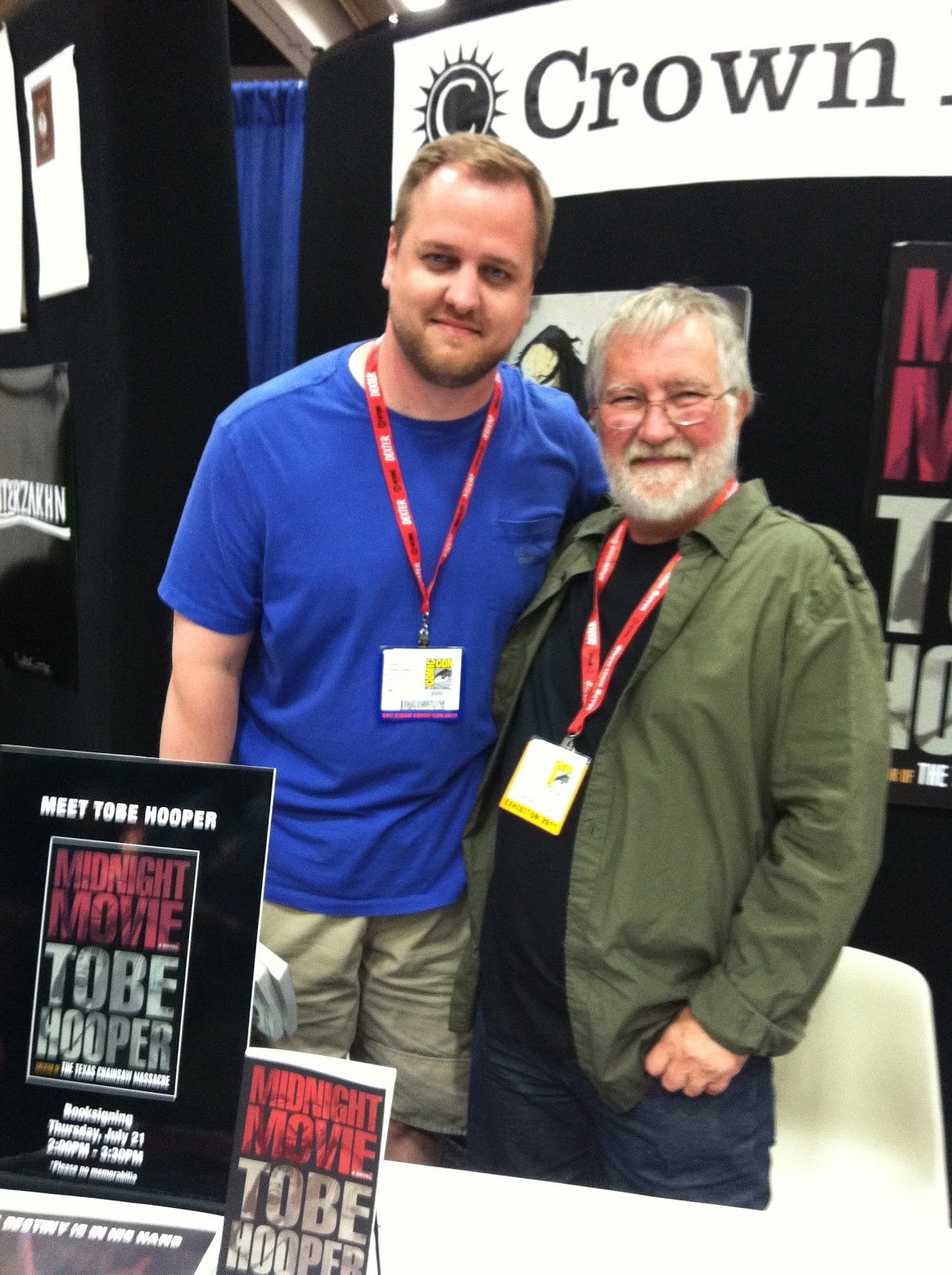 A mini-dog with a mini-hog.Comic-Con was everything I expected: sprawling, crazy, crowded and pretty damned awesome (once you adapt to the sprawling, crazy crowds). The best part: the happy discoveries. Like aimlessly wandering down one aisle to discover that legendary director Tobe Hooper, of Texas Chainsaw Massacre and Poltergeist fame, was signing copies of his debut novel, Midnight Movie. You'd better believe I flipped the switch to FANBOY mode. Below: a pic of me and Mr. Hooper, who turned out to be the nicest, coolest guy to ever dream up a world populated with cannibal families and evil entities who beckon young children into the light.