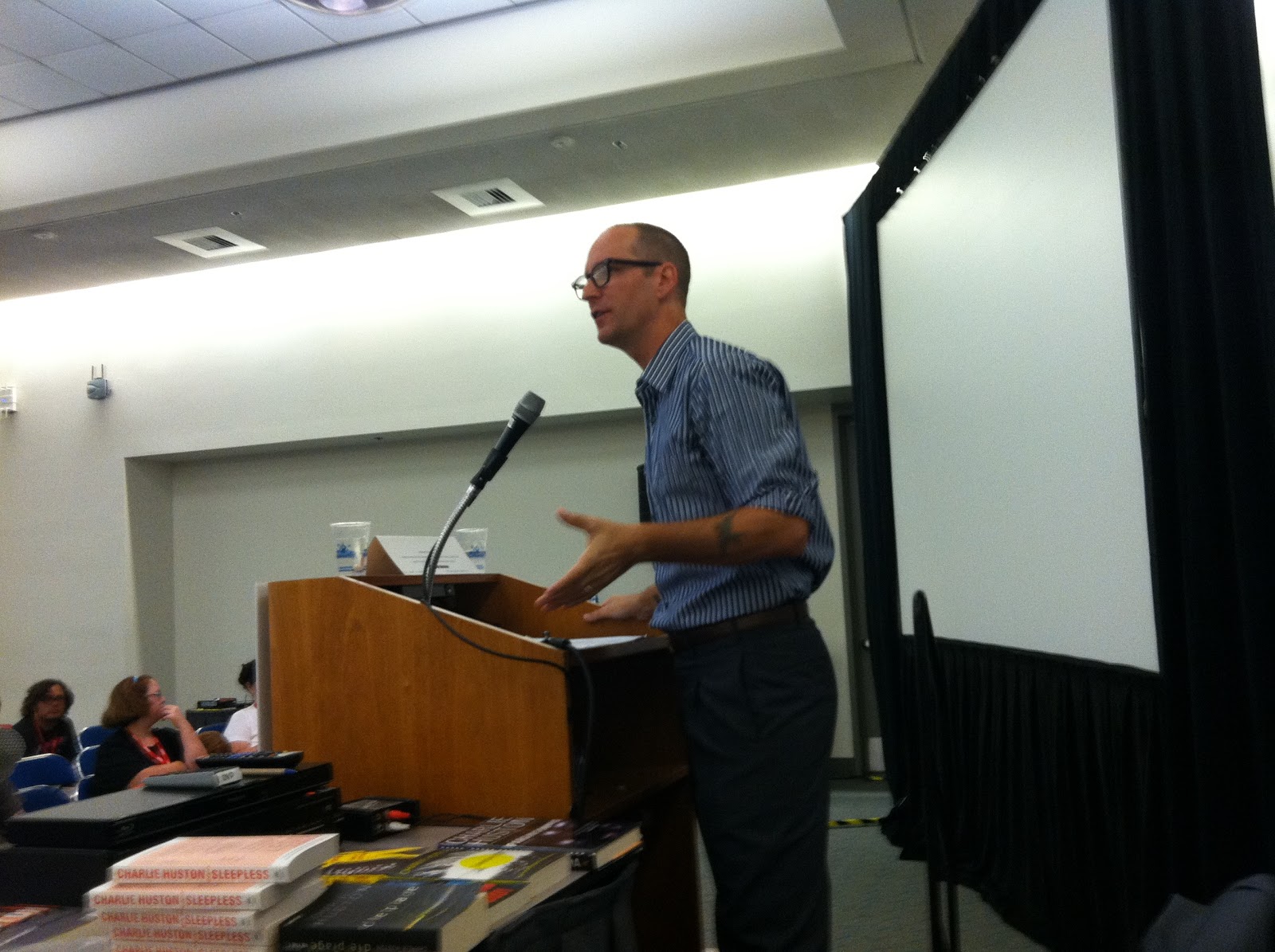 Hanging with Mr. Hooper.Right after this photo was taken I raced over to the Hachette Booth, where I signed copies of Fun & Games for close to an hour. Everyone in line seemed to have a cool first name; I wanted to stop signing and actually jot down a few of them for future use in novels. I was also surprised to see a few youngish kids in line, so I inscribed their copies with a gentle warning: DAVEY, DO NOT READ UNTIL YOUR MOTHER GIVES YOU PERMISSION. Felt kind of like I was corrupting the morals of the young, but hey... you're never too early to hook a new reader.Finally I raced up to Room 7AB where Charlie Huston was conducting his Spotlight panel. Weeks before, Charlie asked a gang of us to be his secret "expert guests" for a quiz game he'd be running. So before I knew it, I was up on stage with Charlie, Daniel (Deadpool) Way and Circle of Confusion manager Kemper Donovan for a fairly absurd-yet-fun game of "What the Fuck." The rules: Charlie would pick an audience member and ask them a question. However, said audience member was not allowed to answer; instead he or she had to tap a member of the expert panel with the phrase, "What the fuck, Daniel Way?" or "What the fuck, Kemper Donovan?" Prizes were awarded even if the so-called experts totally fucked up the answer. So... everybody wins! I think a cable network should give Charlie Huston his own goddamn game show. Here's Charlie in action: