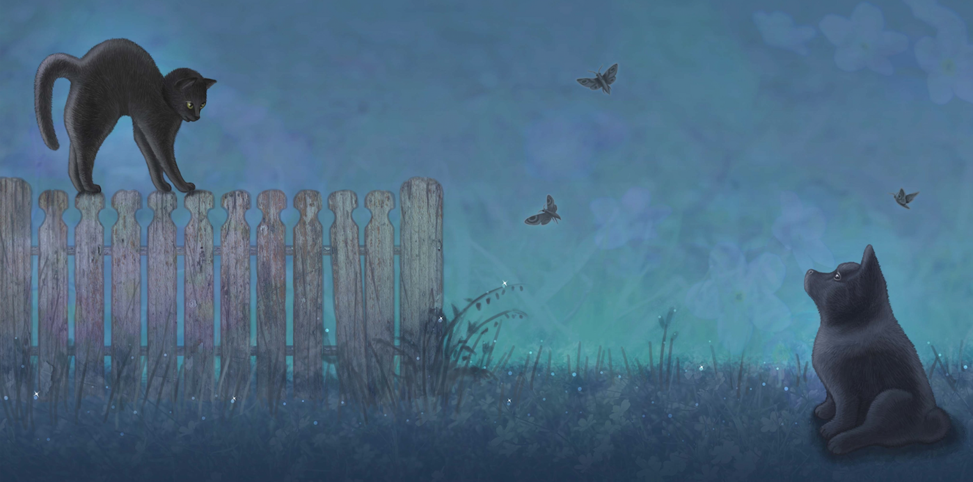 Et Olivia oli juba Mustika joonistamisega korra kätt proovinud, tundus mulle, et ta võiks seda veel teha. Olivia luges minu kirjapandud jutu läbi ja arvas, et võiks proovida küll. Sellest proovimisest sündisid esimesed kaks pilti ja ma olen juba mitmeid päevi nende piltide lummuses. Eriti sinistes öötoonides pildil lendlevate ööliblikate lummuses.