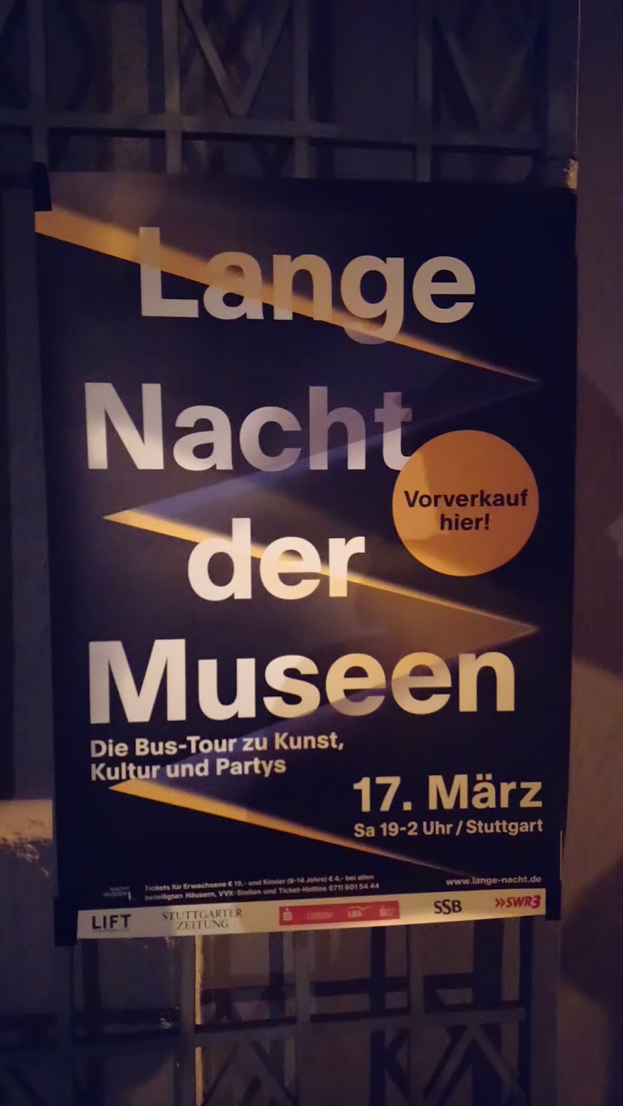 Sõime kõhud kõvasti täis ja tormlesime kultuurat nautima. Stuttgardis oli "Lange Nacht der Museen" ehk Muuseumiöö. Meie klassikalisest öisest muuseumirallist erines ta selle poolest, et kõiki osalevaid muuseume ja kunstigaleriisid sai sõita vaatama kas bussi või U-Bahniga (muidugi võis käia ka jala) ja kõige selle lõbu jaoks tuli lunastada käepael. Selle ettenäitaja pääses siis igale poole sisse ja seesama käepael kehtis ühissõidukites piletina.