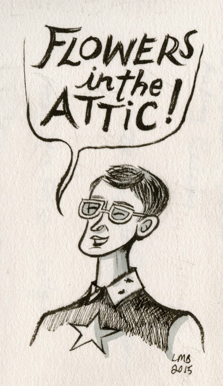 Lisa Brown (Daniel Handler's wife) did this marvelous sketch of me from my Booksmith's SF reading 04/29/2015. It was for one of Michelle Tea's RADAR Production Banned Books events. I was asked to read from a favorite banned Young Adult (YA) book. I read a tawdry scene from Flowers In The Attic by VC Andrews. Everyone had a good time.