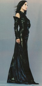 This is actress Carrie Ann Moss, soon after the first Matrix movie came out. She’s wearing a black leather dress by Richard Tyler for an interview in Movieline magazine.