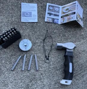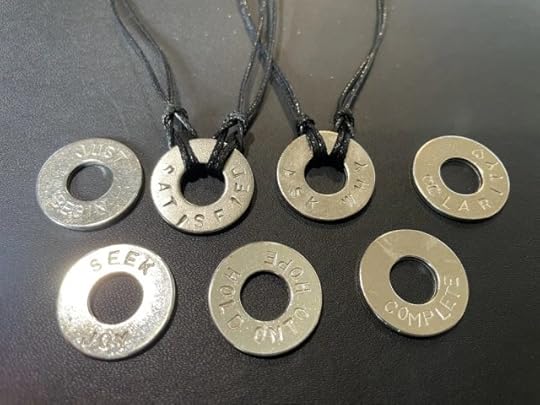 Once the rain finally broke yesterday, I hauled the bracelet-making kit out to the front step and stenciled my bracelet. It’s so…well, satisfying…to whack the stencils into the washer. So what if they’re not perfect?