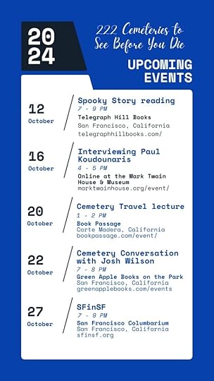 I’ll be showing photos from the book (including the newly added cemeteries) and talking about cemetery travel. Bring your cemetery travel questions!