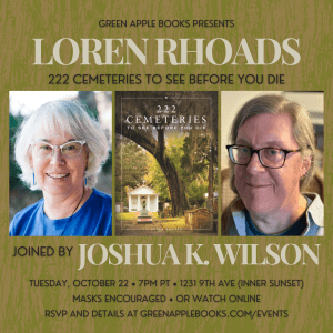 First off, on Tuesday, October 22, I’ll be in conversation with Josh Wilson, editor of The Fabulist, talking about cemeteries as a mirror of the societies around them. We’ll explore history and talk about the future. You can join us in person at Green Apple on the Park in San Francisco or watch online. Here’s the link with all the details: https://greenapplebooks.com/event/2024-10-22/9th-ave-loren-rhoads-joshua-k-wilson