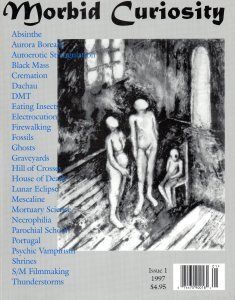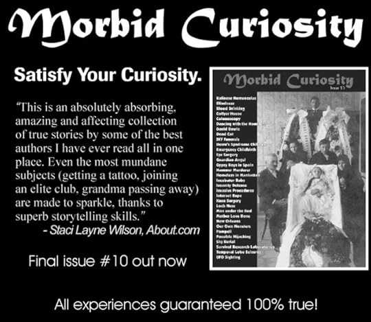 Morbid Curiosity collected true confessional stories from authors around the world. Some of them were professionals. Others I published for the first time. Topics ranged from bad medical experiences to brushes with serial killers, from what we’d call Dark Tourism to, let’s say, experiments in altering one’s own chemistry.