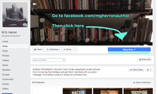 Click “Shop” in the main menu on mgherron.com (top right) Head straight over to my Facebok page for M.G. Herron, and look for the “Shop Now” button, as demonstrated belowThe coolest part of this is that I have only a VERY FEW copies left of the first edition of The Aur...