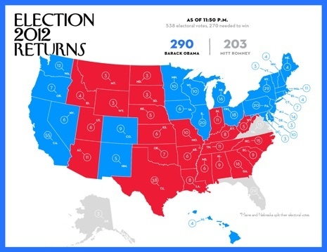 As I’m writing this, Florida and Virginia remain too close to call, but it looks like Obama will win them both. That would give him three hundred and thirty two votes in the electoral college, and leave Mitt Romney with two hundred and six. That’s a bit bigger margin than I and most of the pundits and forecasters predicted. Once the votes in California and the rest of the West are counted, Obama will most likely win the popular vote, too.