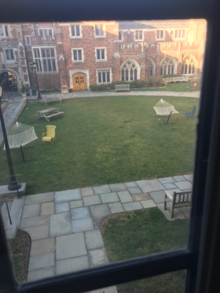 The other thing is even simpler and you can see it in the rather grainy picture taken from my apartment window at the top of this post. It���s the large hammocks on the grass in (the newly renamed) Grace Hopper college. If I had taken the picture at a different time of day, you would have seen students, or pairs of students happily sprawling in them. Looks absolute bliss. Can���t we have some of those in Cambridge, I thought? And for the profs too? (Or maybe there are some already that I have missed?)