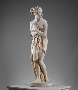 Second, was the claim that I think was the big underlying point of the exhibition: namely, that the idea of Italy as cultural and eventually political unity was kickstarted by expropriations and then return of these objects. The last room featured Canova���s ���Venus Italica��� (crucial epithet, and you see her above) and the series early nineteenth busts of great Italian artists that Canova had sponsored. Risorgimento this way.