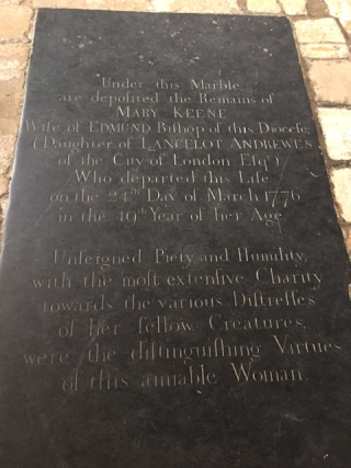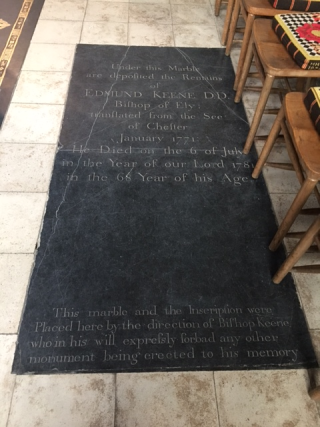 I found myself pondering on the memorial of Bishop Keene, who died in 1781, set elegantly into the floor of one of the chantry chapels.