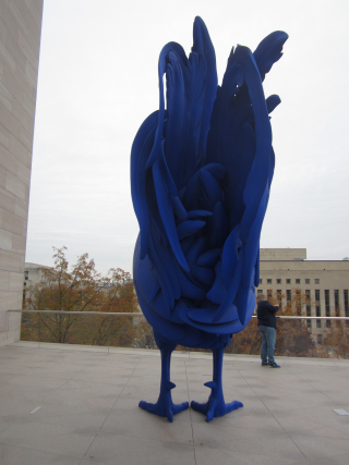 Do you remember that blue cockerel on the fourth plinth in Trafalgar Square a few years ago? Well it has just landed on the roof terrace of the newly restored and rearranged East Wing of the National Gallery in Washington DC, where I had the privilege yesterday of getting up closer than was possible in London, and (as you see) of gazing right up his bum. He gazes off the terrace, more or less in the direction of the Capitol -- as if, we couldn't help thinking, he was making a comment on the current political scene. Come on Washington DC, wake up!
