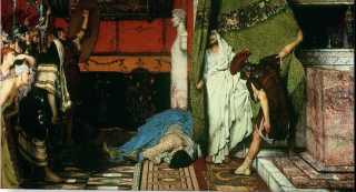I hadn't quite noticed before how dynastic the scene is. The main incident is, of course, the murder of Caligula and the revelation of Claudius found behind the curtain, about to be hailed emperor almost by accident. But the statue behind is recognisably Augustus, the founder of the Julio-Claudian dynasty.