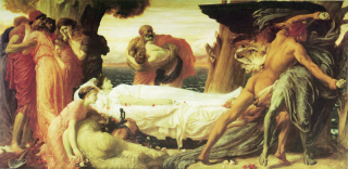 It is by someone we knew about as a stained glass maker, Thomas Camm, and hadn���t realised he extended much wider. This appears to be an original pen and ink drawing (though that���s a bit hard to say, as it is under glass: has anyone seen another version?) ��� on the subject of Frederic Leighton���s ���Hercules Wrestling with Death for the Body of Alcestis���, first exhibited at the Royal Academy in 1871. It���s now in Hartford, Connecticut.
