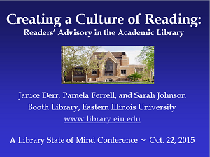 Then on Wednesday (my birthday!) I headed out to Peoria for the Illinois Library Association conference. Two library colleagues, Janice Derr and Pam Ferrell, and I gave a presentation Thursday morning on readers' advisory in the academic library, with resources supporting academic libraries' establishment of popular reading collections. For those slides, which are hosted in EIU's institutional repository, visit the link and click on the Download button.